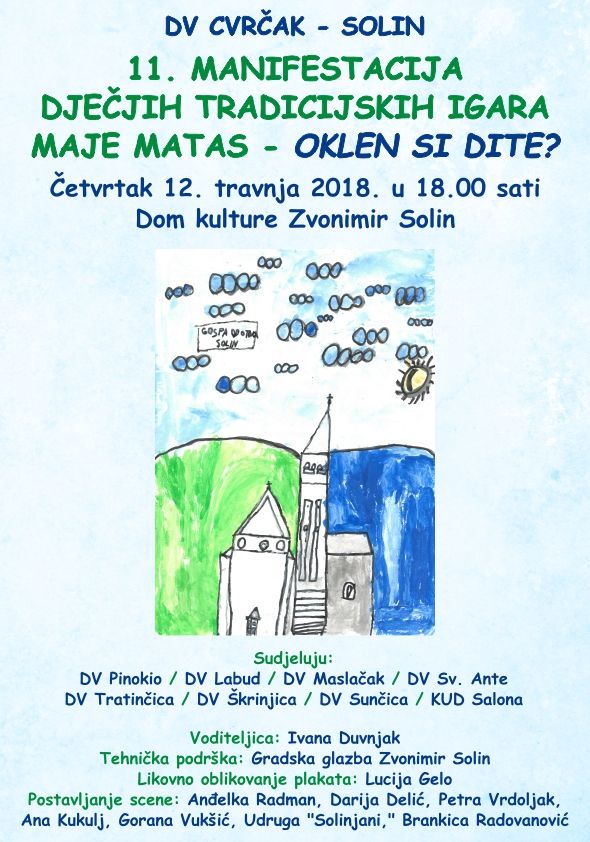 Dječji vrtić Cvrčak Solin u četvrtak 12. travnja 2018. u Javnoj ustanovi kulture Zvonimir s početkom u 18 sati organizira manifestaciju dječjih tradicijskih igara Maja Matas – Oklen si dite?