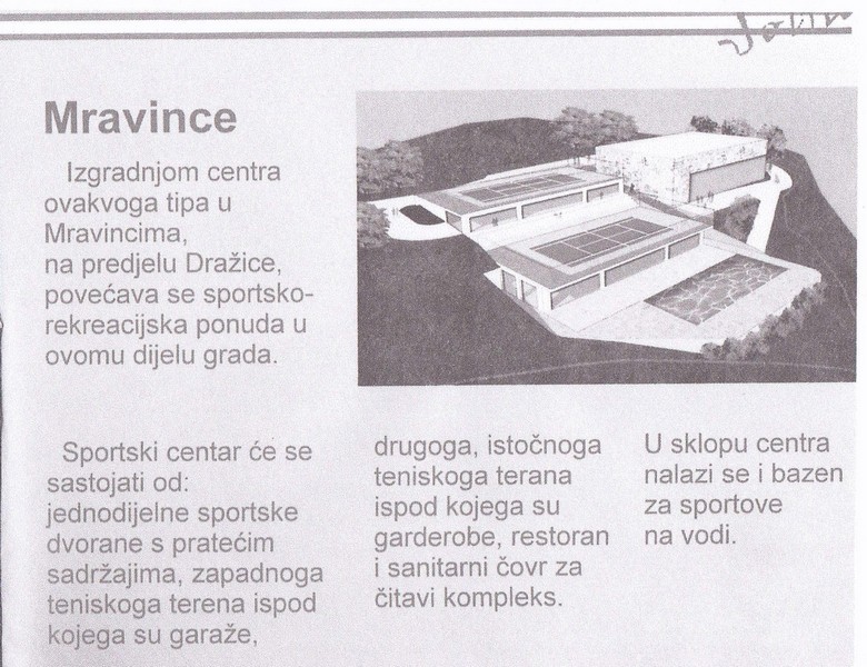 Projekt Sportski centar Mravince, u sklopu kojeg je trebala biti jednodijelna sportska dvorana, teniski tereni, podzemni parking i restoran.