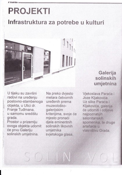 Gradska galerija umjetnina planirana je u novoj zgradi u Zvonimirovoj u poslovnom prostoru od 240m2. Trebala je po riječima saborskog zastupnika, u tom vremenu gradonačelnika Blaženka Bobana “dodatno osnažiti status Solina kao jednog od kulturnih središta ovog našeg prostora”, kao i “u znatnoj mjeri rasteretiti Dom “Zvonimir” kroz koji se odvijaju brojna događanja”.