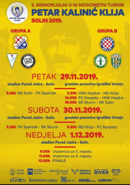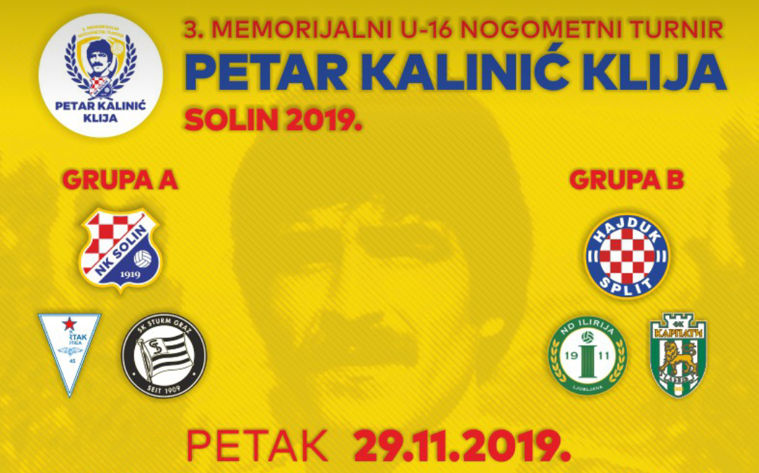 Od petka do nedjelje na stadionu Pokraj Jadra i na pomoćnom gradskom terenu s umjetnom travom u Vranjicu održati će se 3. po redu memorijalni nogometni turnir U-16 „Petar Kalinić – Klija“ Solin 2019. koji se održava u znak sjećanja na legendarnog igrača i trenera NK Solin koji je preminuo prije 3 godine nakon teške bolesti.