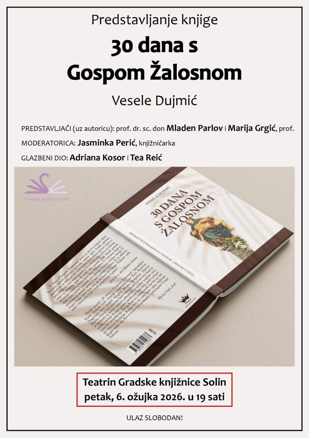 Gradska knjižnica Solin poziva na predstavljanje zbirke poezije „30 dana s Gospom Žalosnom” spisateljice Vesele Dujmić. Predstavljanje će se održati u petak, 6. ožujka u Teatrinu GK Solin s početkom u 19 sati.