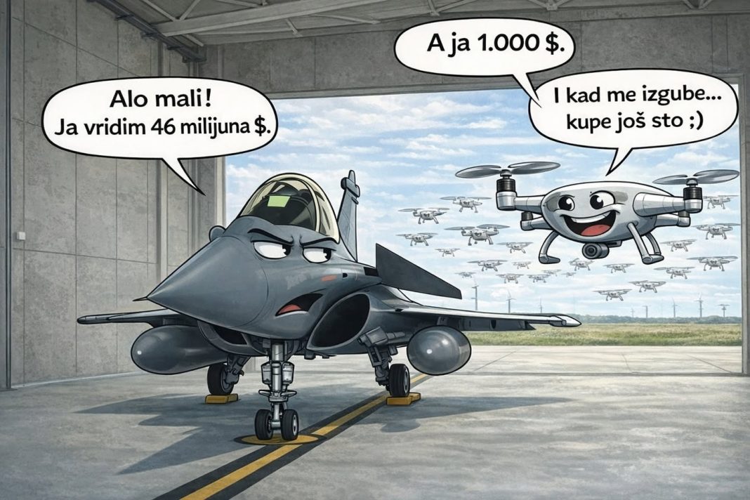 Na jednoj strani stoji borbeni avion vrijedan 46 milijuna dolara. Simbol prestiža, tehnologije i nacionalnog ponosa. Na drugoj strani je dron od tisuću dolara, neugledan, potrošan i bez ikakve romantike. Ipak, dok avion čeka savršene uvjete, logistiku i zaštitu pilota, dron već leti. Ako ga izgube? Nema minute šutnje. Kupe još sto.