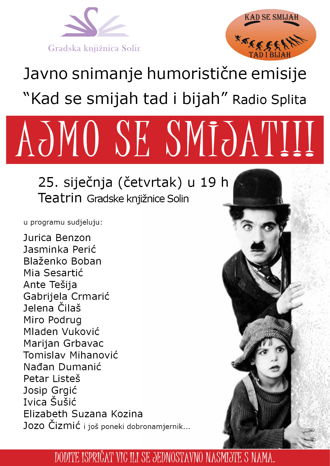 Gradska knjižnica Solin poziva na tradicionalnu večer smijeha i dobrog raspoloženja pod imenom “AJMO SE SMIJAT!!!” .