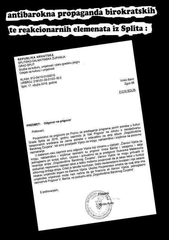 Neki dobri ljudi zamolili su me da napišem par stotina rečenica – uglavnom u vezi odbijenice financijske potpore splitskog vijeća za nakladništvo mom novom strip albumu “Dogodovštine Baroknog Čovjeka” – pa ću to i napisat, nadam se ne u obimu od par tisuća rečenica.