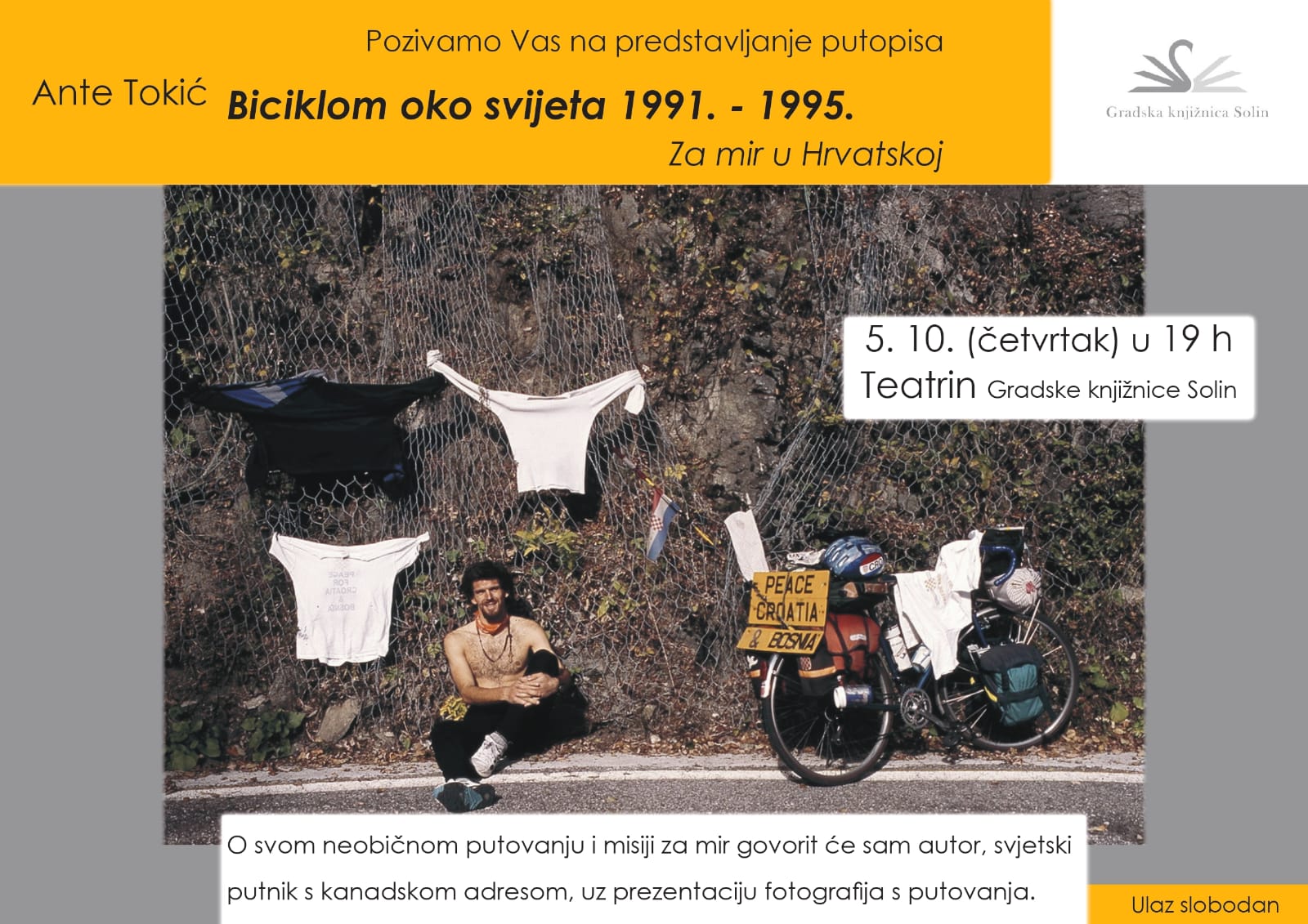 U Teatrinu Gradske knjižnice Solin 5. listopada (četvrtak) s početkom u 19 h održat će se predstavljanje knjige Ante Tokića “Biciklom oko svijeta 1991. – 1995.: Za mir u Hrvatskoj”. O svom neobičnom putovanju i misiji za mir govorit će sam autor, svjetski putnik s kanadskom adresom, uz prezentaciju fotografija s putovanja.