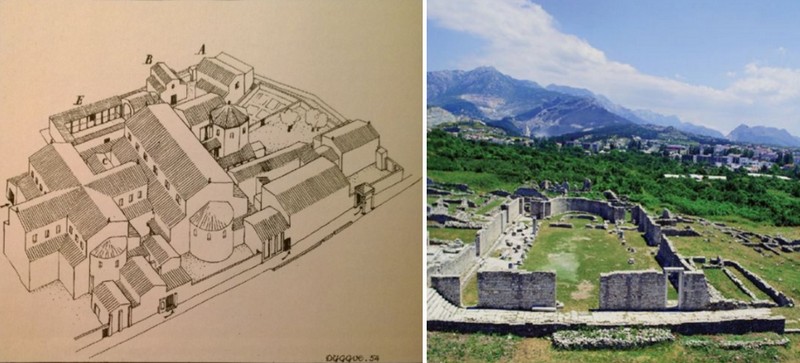 Rekonstrukcija izgleda nekadašnjeg episkopalnog centra Salone (prema E. Dyggveu); današnje ruševine sjeverne bazilike (tzv. basilica urbana)