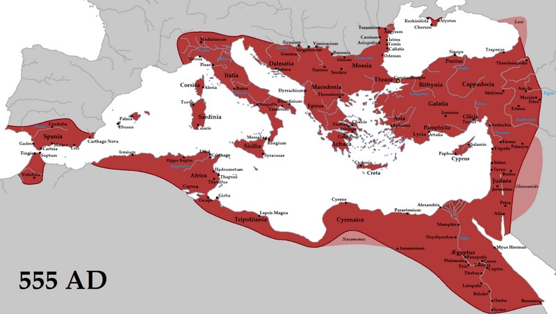 Bizantsko Carstvo oko 555. godine, nakon Justinijanove rekonkviste na Zapadu kojom su pod rimsku vlast vraćena područja u Dalmaciji, Italiji, Africi i južnom dijelu Hispanije