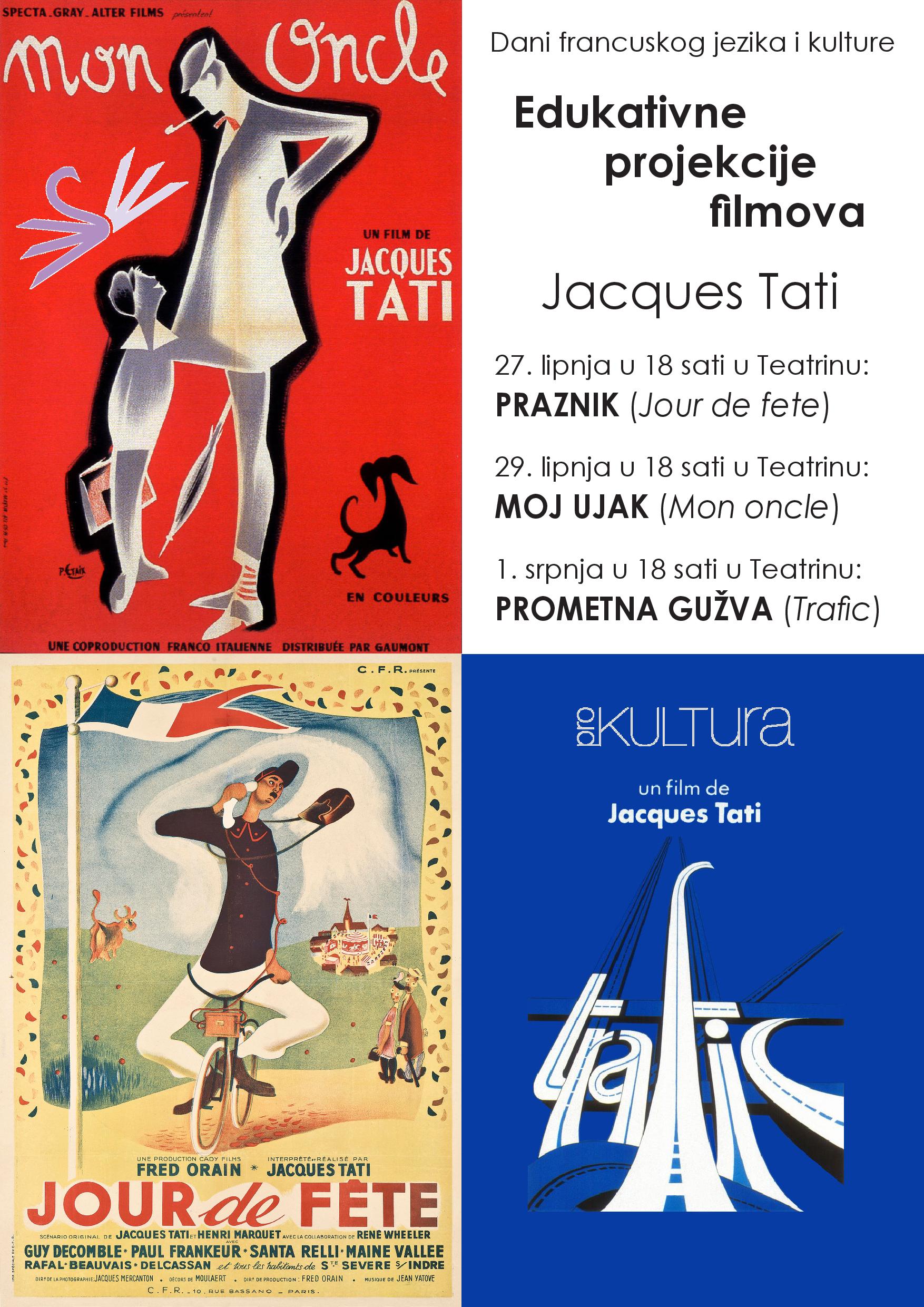edukativne projekcije filmova jacquesa tatija 6-page-001U sklopu manifestacije Dani francuskog jezika i kulture koji se od 27. lipnja do 4. srpnja održavaju u Omišu, Splitu, Solinu, Kaštelima i Trogiru Gradska knjižnica Solin i Prokultura Split priređuju niz edukativnih projekcija starih francuskih filmskih klasika.