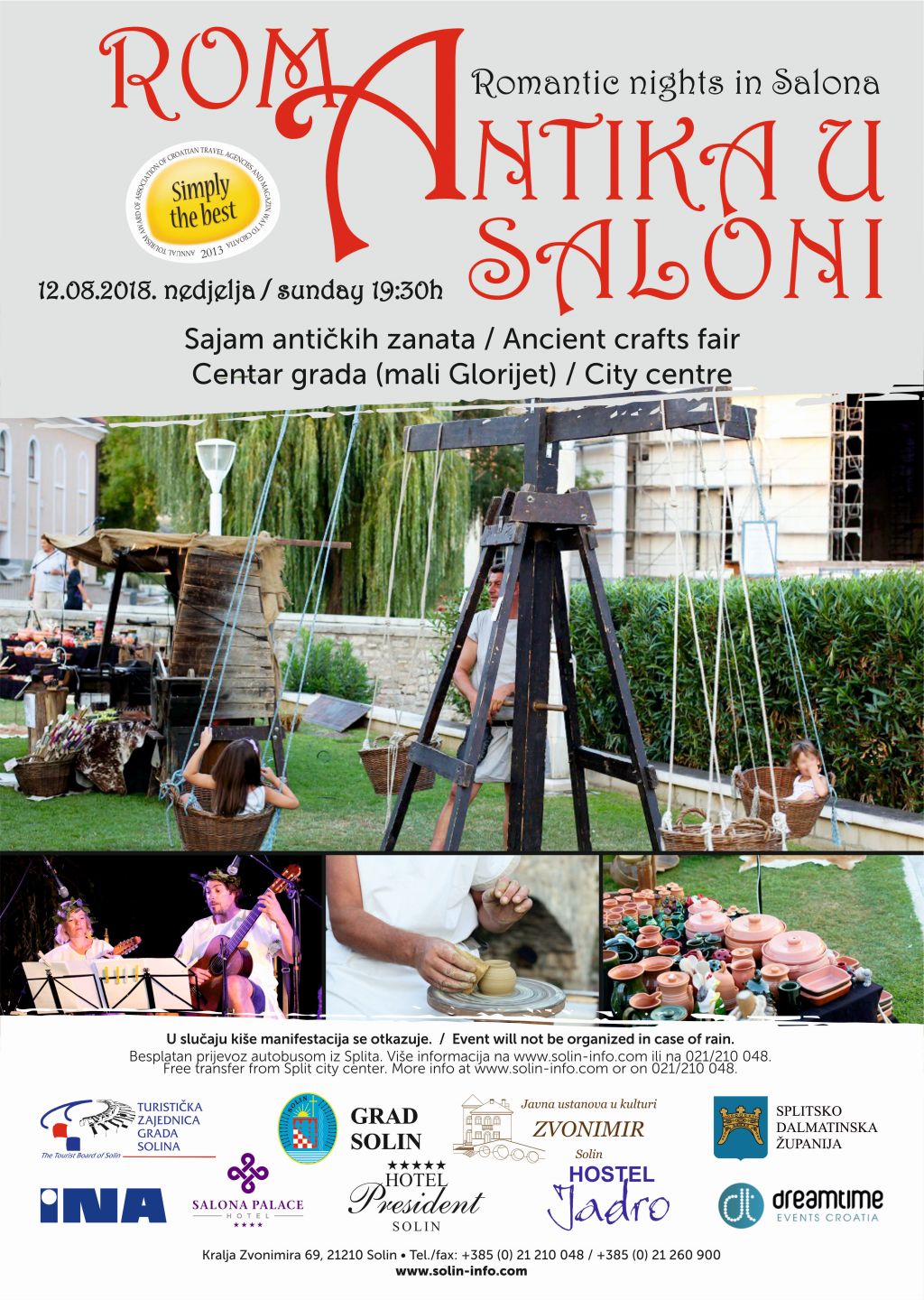 Sajam antičkih zanata održat će se u nedjelju 12. kolovoza 2018. u centru grada Solina, točnije na malom Glorijetu, s početkom u 19.30 sati .