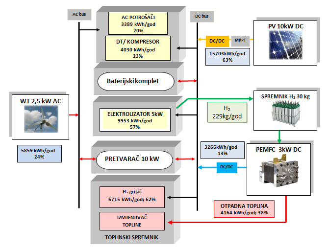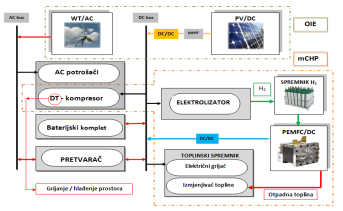 Samostalni hibridni energetski sustav sastoji se od fotonaponskog panela PV i vjetroagregata WT, kao obnovljivih izvora, dok se mCHP sastoji od podsustava niskotemperaturnih gorivnih članaka (PEMFC, elektrolizator i spremnik H2), električne dizalice topline (DT) i toplinskog spremnika (TS).