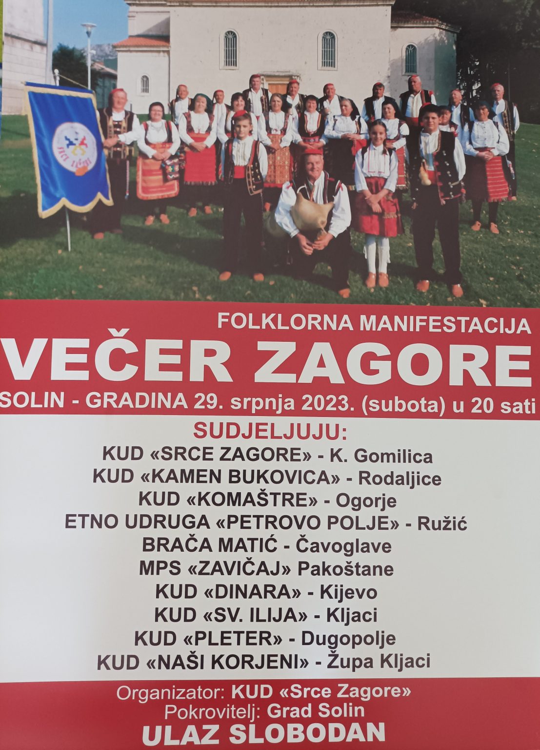 U subotu, 29. srpnja 2023.  godine s početkom u 20:00 sati u organizaciji KUD-a “Srce Zagore” održat će se tradicionalna folklorna manifestacija Večer Zagore u Gradini pod pokroviteljstvom grada Solina na kojoj će nastupiti desetak KUDova iz susjednih gradova i općina.