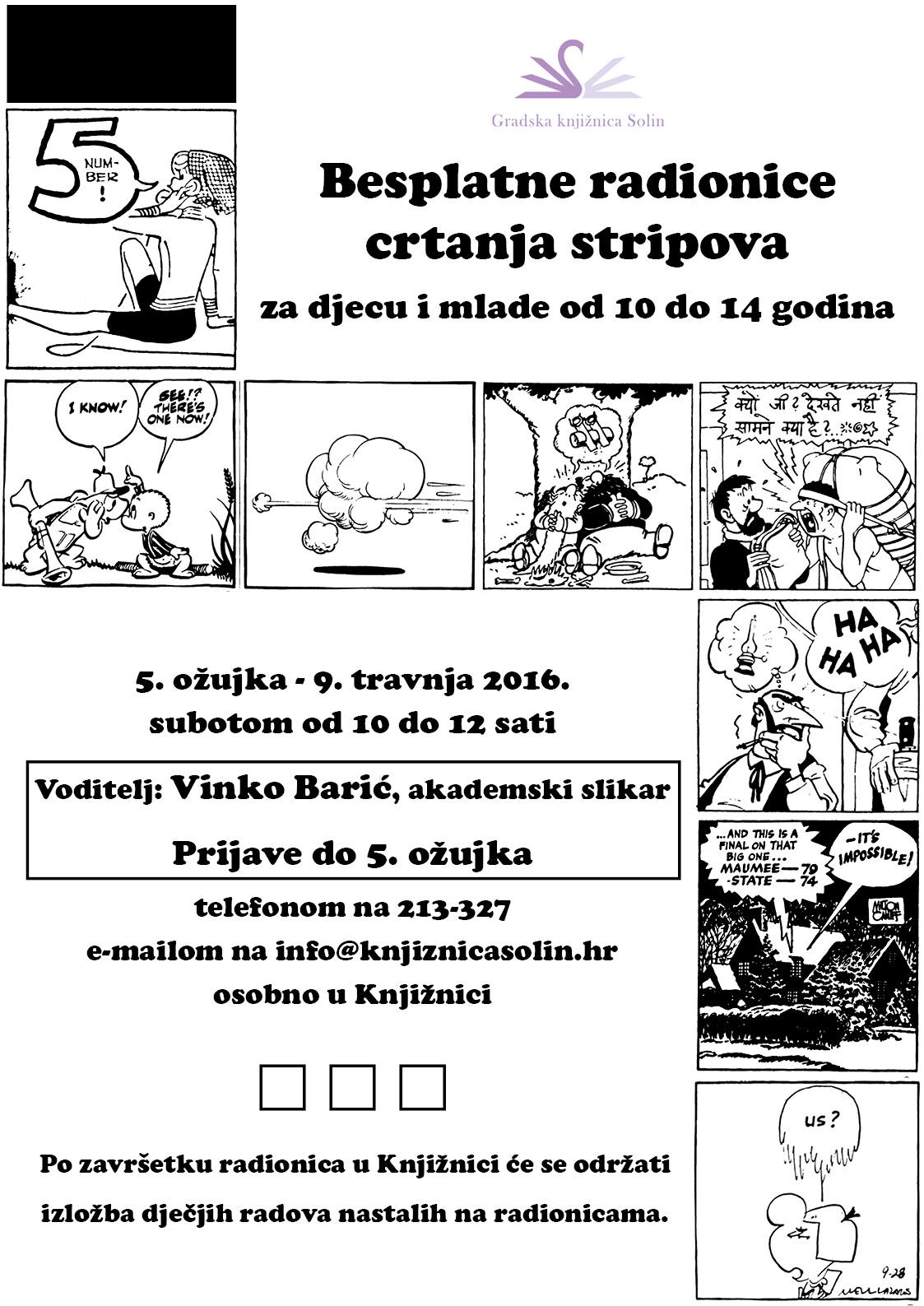 Ovu subotu 05.03., s početkom u 10.00 h GK Solin uz vodstvo akademskog slikara Vinka Barića, organizira besplatne radionice crtanja stripova za djecu i mlade.