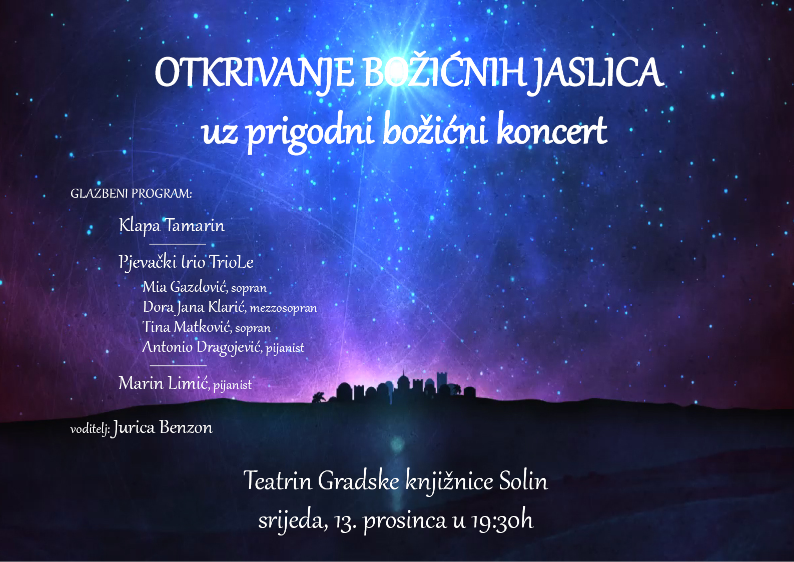 Otkrivanje jaslica dogodit će se u Teatrinu GK Solin u srijedu, 13. prosinca s početkom u 19:30 sati, a samoj svečanosti otkrivanja prethodit će prigodni božićni koncert.