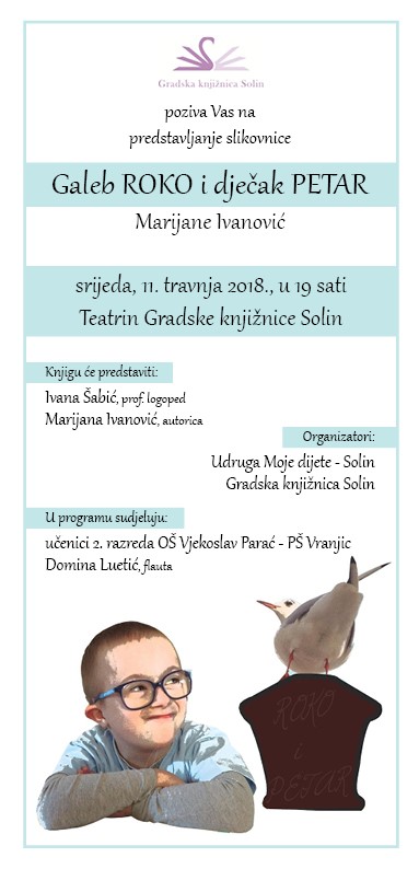 Gradska knjižnica Solin i Udruga Moje dijete – Solin pozivaju na predstvaljanje slikovnice “Galeb ROKO i dječak PETAR” Marijane Ivanović.