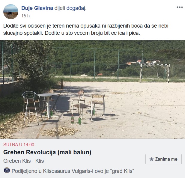 [quote type=”border_top”]Dođite svi očišćen je teren, nema opušaka ni razbijenih boca, da se ne bi slučajno spotakli. Dođite u što većem broju biti će ića i pića.[/quote]