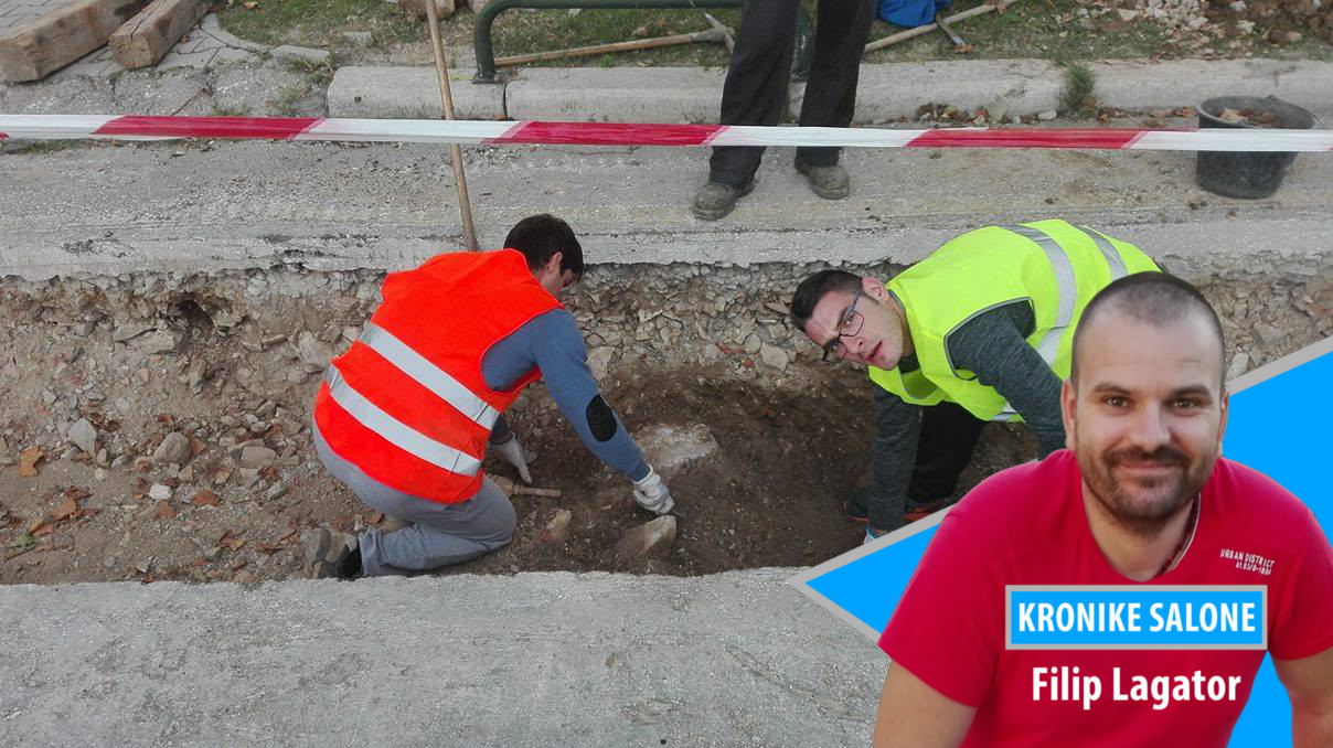 Pisao sam nedavno o šišanju Salone Ultrom. Moram priznat da je ovo daleko originalnija ideja, koja će svoj efekt pokazati za nekoliko godina. Ja već sada skidam kapu nepoznatom autoru projekta jer ovo je fenomenalno. Svi znate da grad Solin muku muči sa kanalizacijskom mrežom. Pazite sad i gledajte šta će se desiti. Polako će nicati kanali po cilom gradu, pomno iskopani kako bi sutra bili upotrebljeni za novu kanalizaciju. U njima ćete naći arheologe koji će provjeriti dubinu i širinu spomenutih kanala, zatim stiže Indiana Jones koji će u novom filmu u tim kanalima  tražit dlaku sa jednog od izgubljenih konja Zvonimirove ergele, da bi se naposljetku ti kanali iskoristili za kanalizaciju.