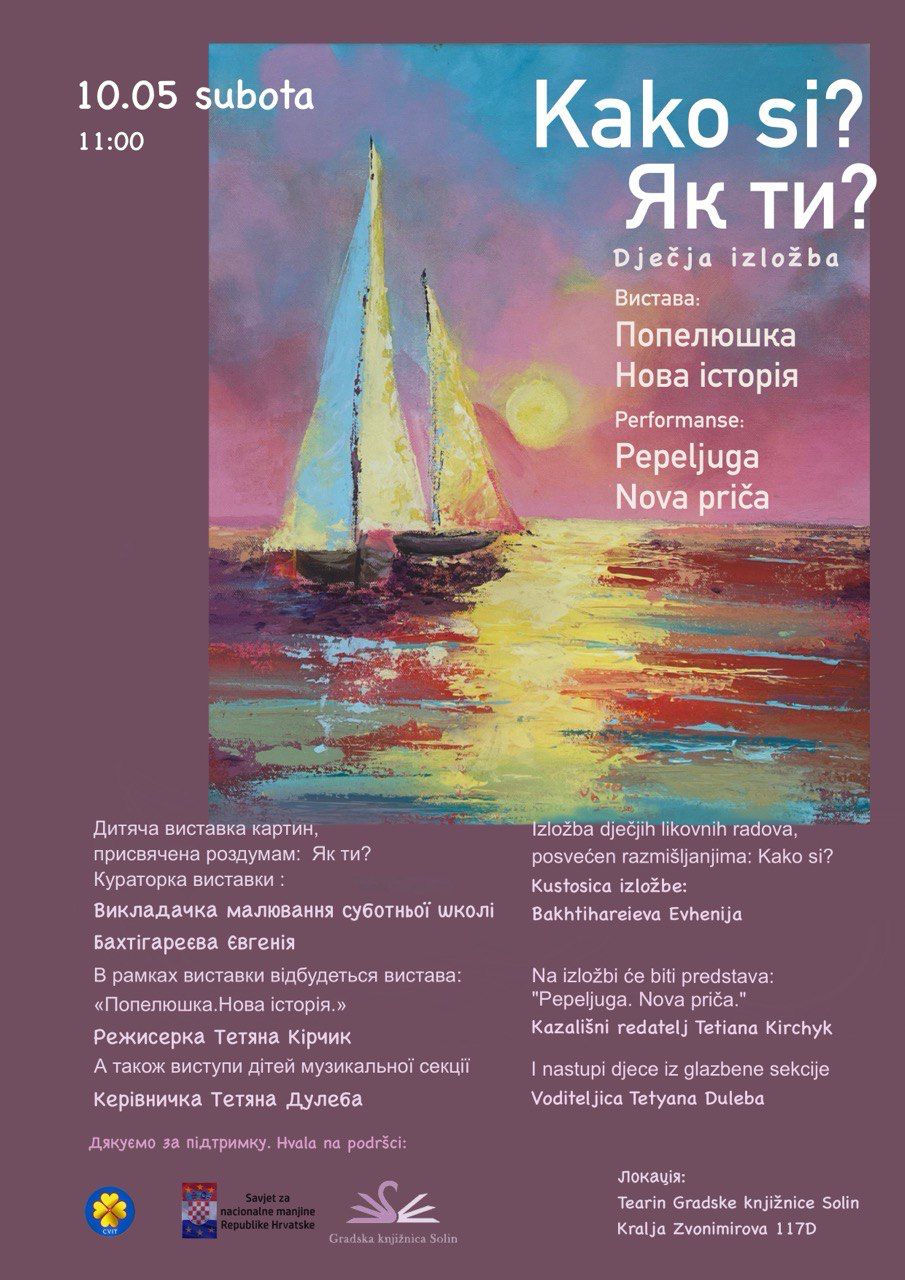 Kulturno društvo Ukrajinaca u Splitu CVIT i Savjet za nacionalne manjine Republike Hrvatske pozivaju na otvorenje izložbe dječjih slika “Kako si?” koje će se održati u Teatrinu Gradske knjižnice Solin u subotu, 10. svibnja u 11 sati.