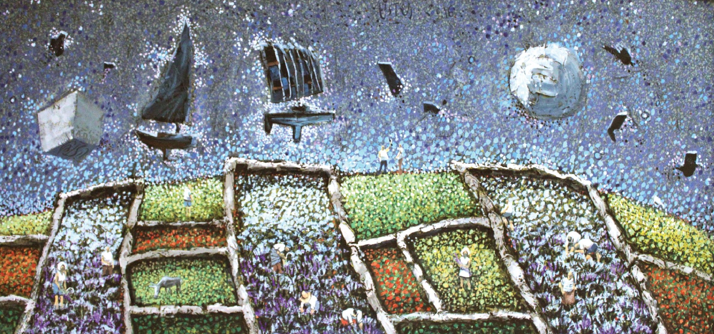 „… Na Ivanovim slikama kao da se mikrokozmos i makrokozmos stapaju, nestaju granice, gube se odnosi veličina, sva materija se prožima i odjednom sve postaje moguće. Na sićušnim svemirskim školjkama rastu vitki čempresi, stoje male i trošne dalmatinske kućice i labirinti drvenih suhozida. Ribari kozmonauti veslaju kroz galaktička prostranstva u potrazi za nebeskim ribama, dok se na jarbolima vijore zastave Dalmacije….“Plakat - Listes-page-0012
