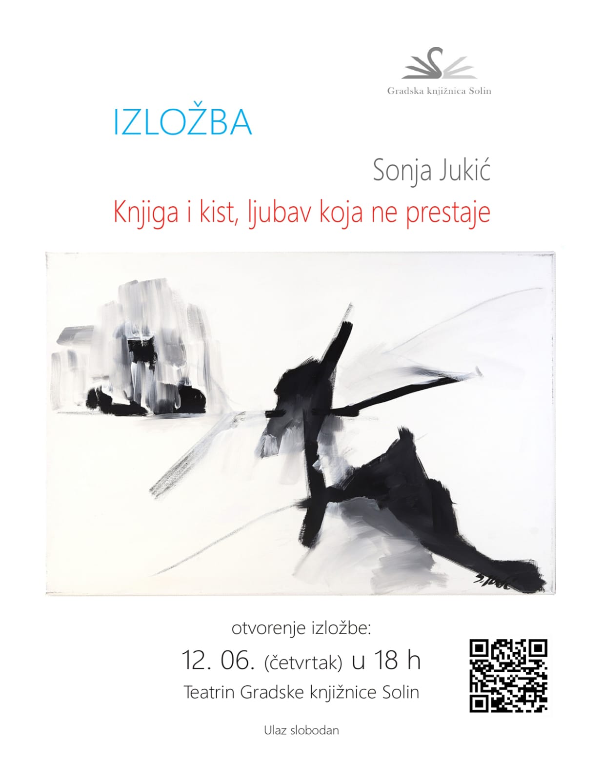 Autorica slika je splitska umjetnica Sonja Jukić, a radovi koji će biti izloženi u Teatrinu nadahnuti su probranim književnim djelima s kojim su se susretali polaznici čitateljskog kluba Kult(na)ura koji se jednom mjesečno sastaju u čitaonici GK Solin.