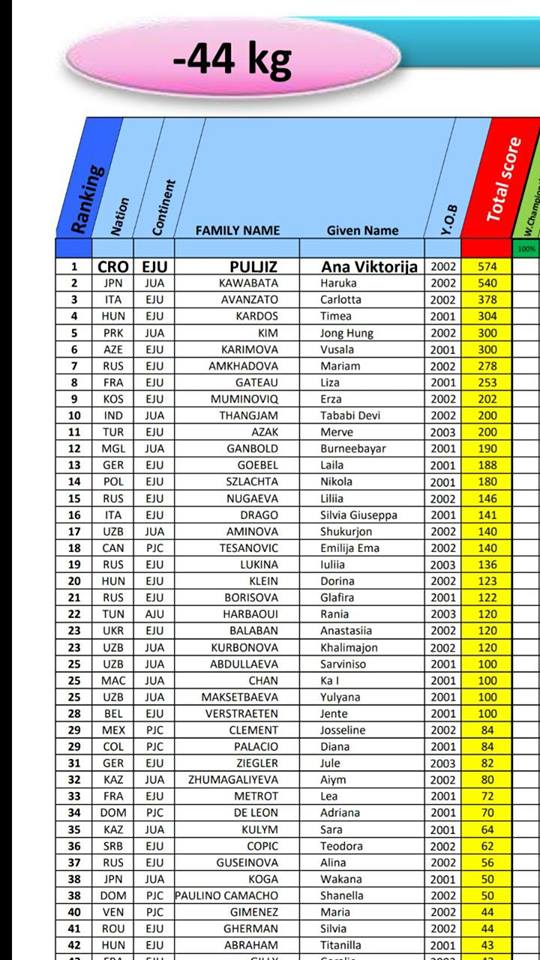 Ana viktorija Puljiz, inače članica JK Solin, vodeća je na svjetskoj rang listi do 44kg u ženskoj kategoriji.
