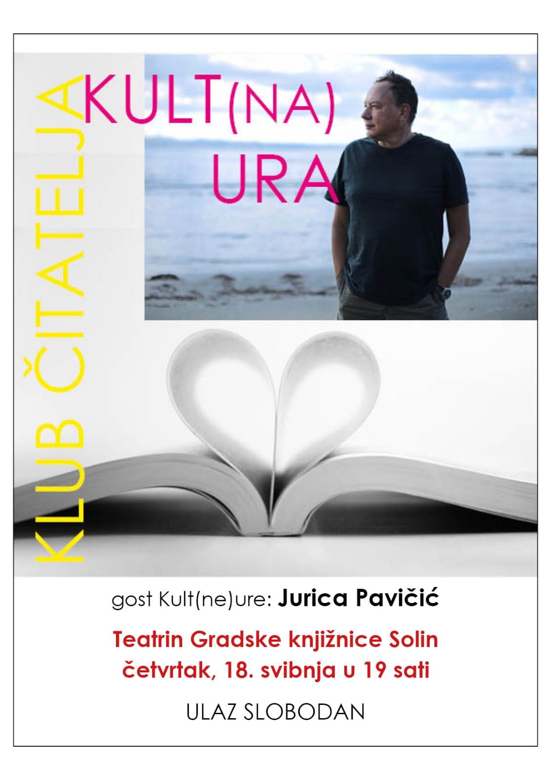 Gost ovomjesečnog Kluba čitatelja Gradske knjižnice Solin Kult(na) ura je splitski književnik Jurica Pavičić. Na susretu koji će se oržati 18. svibnja (četvrtak) u 19.00 h u Teatrinu Gradske knjižnice Solin razgovarat će se o njegovim romanima Crvena voda (2017.) i Mater Dolorosa (2022.).