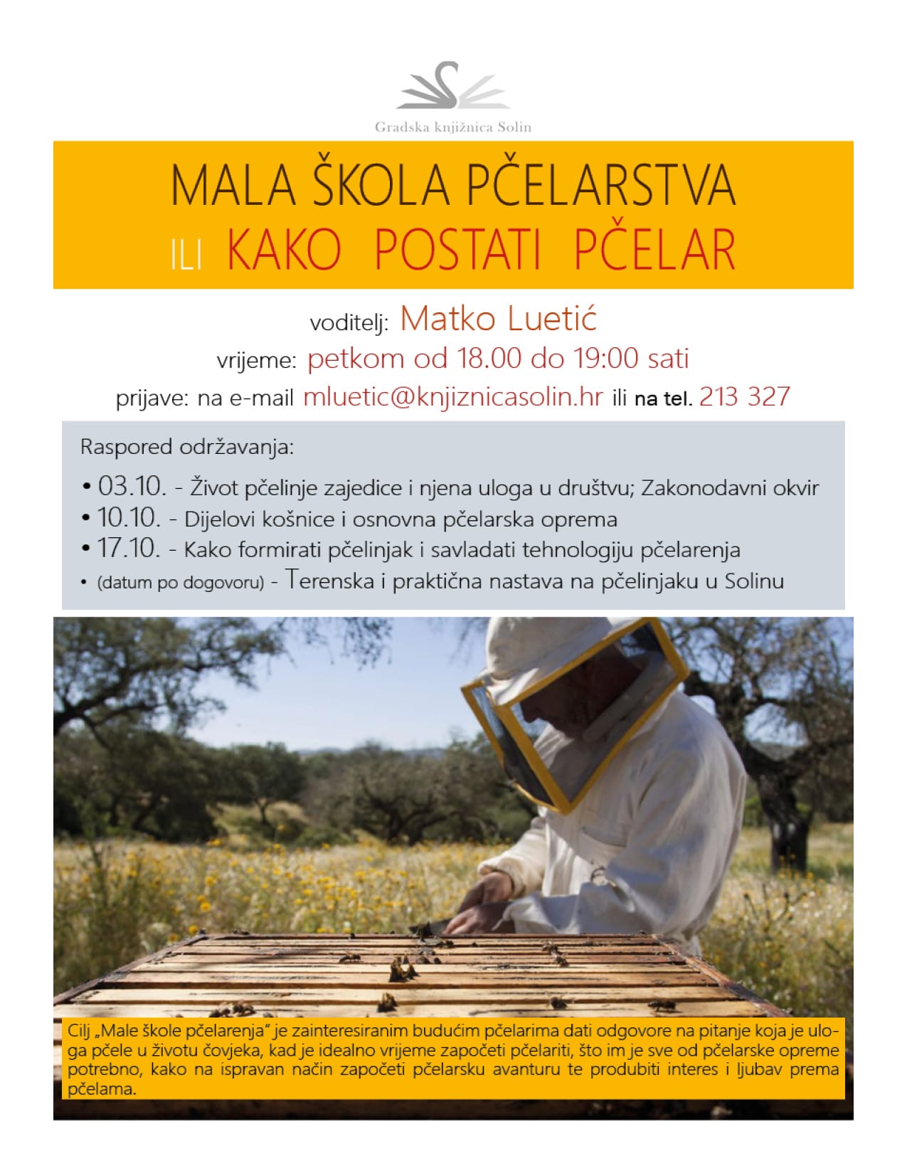 Voditelj Male škole pčelarstva je Matko Luetić, knjižničar i dugogodišnji pčelar, a glavni cilj Male škole pčelarstva je zainteresiranim budućim pčelarima dati odgovore na pitanja: koja je uloga pčele u životu čovjeka, kada je idealno vrijeme za početi pčelariti, što je sve od pčelarske opreme potrebno, kako na ispravan način započeti pčelarsku avanturu, produbiti interes i ljubav prema pčelama.