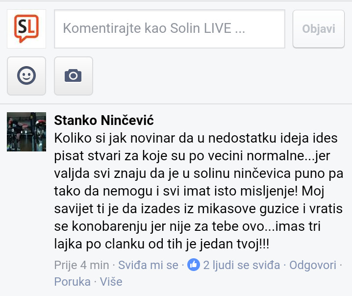 Iz dana u dan upoznajemo jednog po jednog s njihove liste za gradsko vijeće, (TRIO RIO” NEZAVISNE LISTE MLADIH – SOLIN) a danas ćemo predstaviti gospodina Stanka Ninčevića s njegovim javnim komentarom upućenim meni osobno, na Facebook stranici neovisnog portala Solin Live.