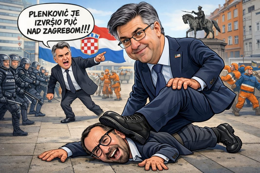 Karikatura često kaže ono što politika pokušava prikriti. Prizor u kojem premijer Andrej Plenković stoji nogom na zagrebačkom gradonačelniku Tomislavu Tomaševiću, dok predsjednik Zoran Milanović viče da je “Plenković izvršio puč nad Zagrebom”, jasna je i brutalna politička poruka.