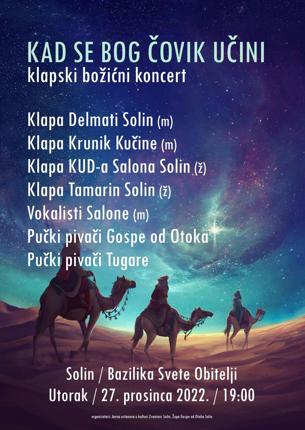 Javna ustanova u kulturi Zvonimir Solin u suradnji sa Župom Gospe od Otoka priređuje klapski božićni koncert “Kad se Bog čovik učini”, koji će se održati u utorak, 27. prosinca 2022. u Bazilici Svete Obitelji u Solinu s početkom u 19 sati. Sudjeluju klapa “Krunik” Kučine (m), klapa KUD-a “Salona” Solin (ž), klapa “Delmati” Solin (m), klapa “Tamarin” Solin (ž), Vokalisti Salone (m), Pučki pivači Gospe od Otoka Solin (m) i Pučki pivači Tugare (m). Voditeljica programa je Edita Lučić Jelić, a ulaz je slobodan.