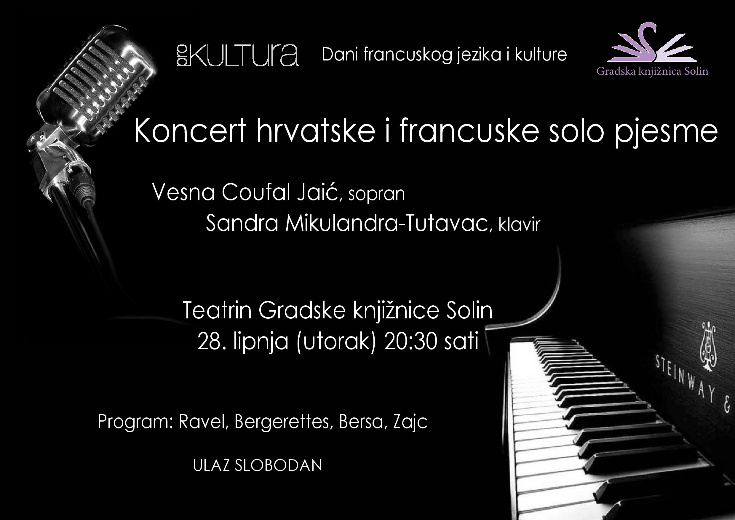 Koncert će se održati u utorak, 28. lipnja u Teatrinu Gradske knjižnice Solin s početkom u 20:30 sati, a na koncertu će nastupiti sopranistica Vesna Coufal Jaić iz Osijeka dok će je na klaviru pratiti Sandra Mikulandra-Tutavac. na programu su djela Ravela, Bergerettesa, Bersa, Zajc, Hatzea i Dore Pejačević.