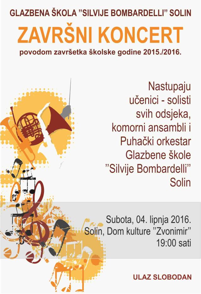 Učenici Glazbene škole “Silvije Bombardelli” Solin priređuju koncert povodom završetka nastavne godine 2015./16. Na koncertu će nastupiti solisti, komorni sastavi i puhački orkestar Glazbene škole. Koncert se održava danas u Domu kulture “Zvonimir” u Solinu, s početkom u 19:00 sati.