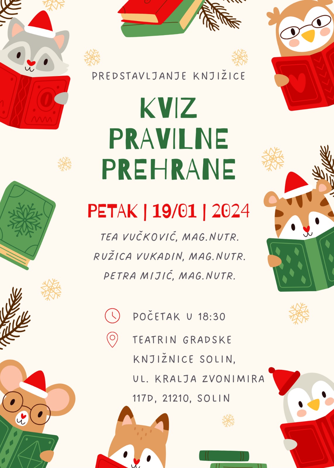 Udruga Zdravi dan i Gradska knjižnica Solin pozivaju vas da im se u petak, 19. siječnja s početkom u 18:30 sati pridružite u Teatrinu GK Solin na predstavljanju knjižice “Kviz pravilne prehrane”. Ova knjižica je nastala u sklopu projekata “Mala škola zdravih navika” Udruge Zdravi dan te nudi uvide u pravilnu prehranu za djecu.