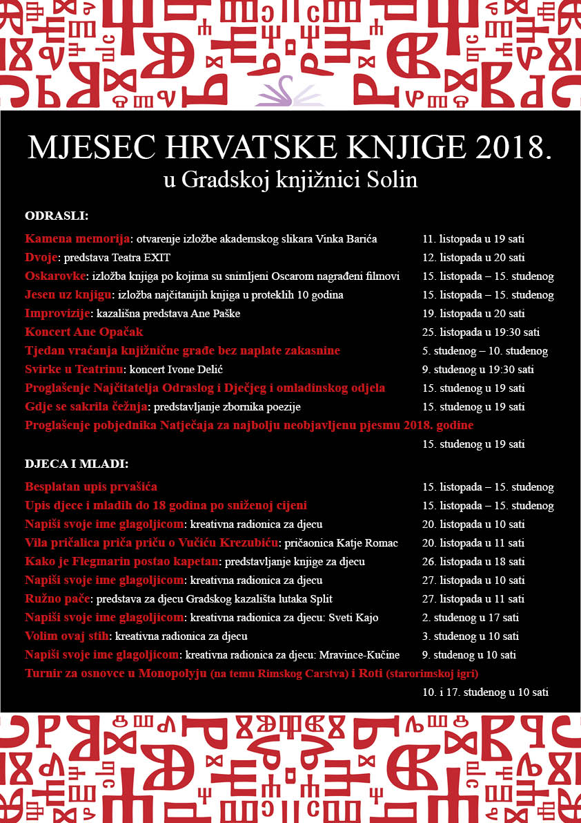 Gradska knjižnica Solin i ove se godine nizom aktivnosti uključila u obilježavanje Mjeseca hrvatske knjige koje se održava pod glavnom temom ‘Baš baština’.