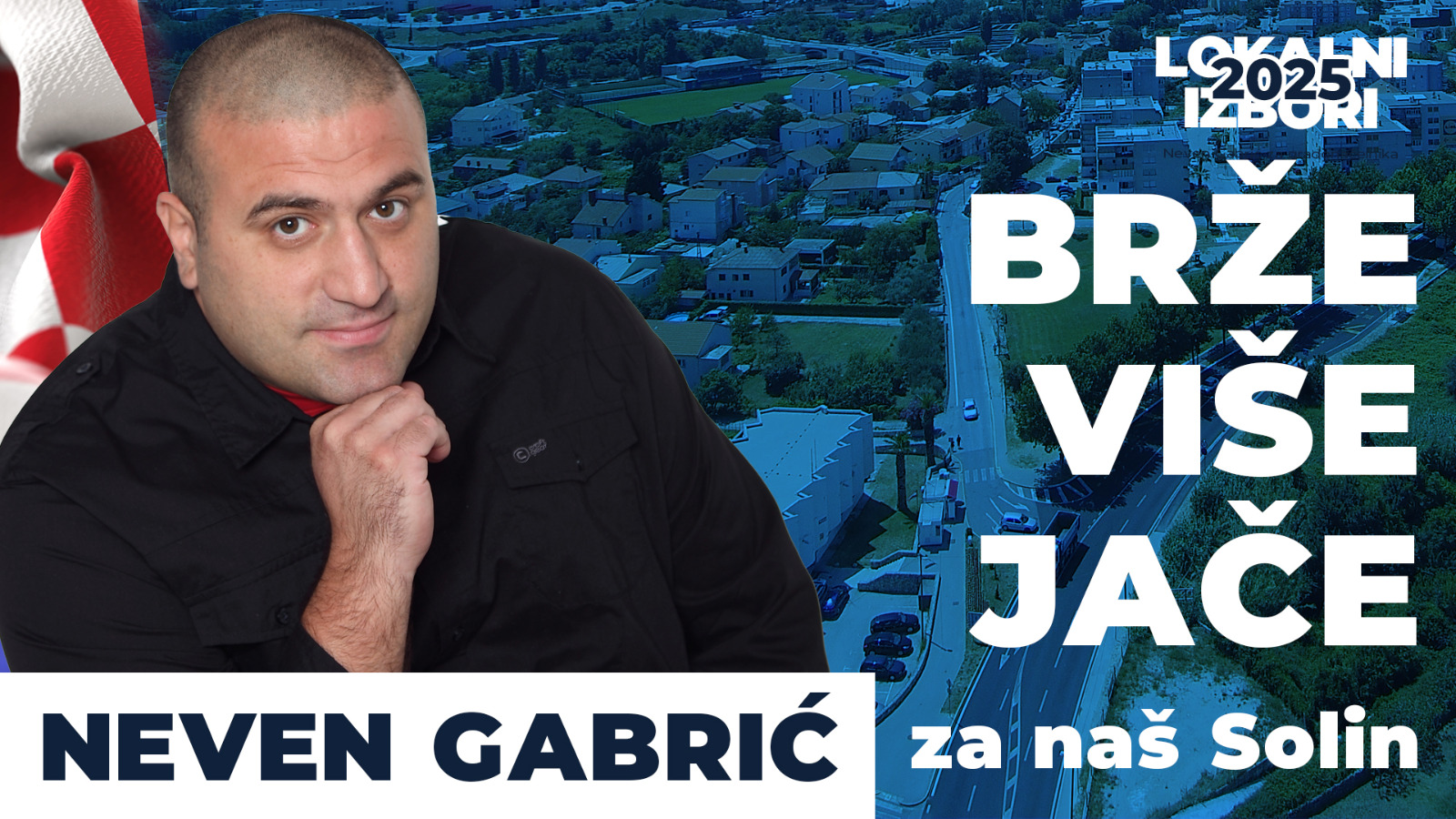 Ja, Neven Gabrić, s ponosom objavljujem svoju kandidaturu za gradonačelnika našeg grada. Nakon godina predanog aktivizma i borbe za bolje sutra Solina, odlučio sam zakoračiti korak dalje i preuzeti glavnu odgovornost za budućnost našega grada.