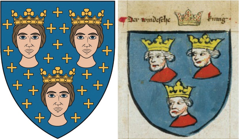 Čini se da je isti „leopardov“ lik otpočetka dobio i svoju stiliziranu heraldičku varijantu koja se pojavljivala uglavnom u europskim grbovnicima kao antropomorfizirani prikaz leopardovih glava u različitim stupnjevima, od blagih naznaka ljudskoga lika pa sve do potpuno ljudskih fizionomija. Tako u armorijalu „Wijnbergen“ odnosno jednoj zbirci grbova nastaloj u Francuskoj tijekom druge polovice XIII. stoljeća nalazimo grb „kralja Slavonije” (le Roi dezclauonie): na plavome tri okrunjena ženska poprsja (u položaju 2:1), dok je polje štita posuto zlatnim križićima. Sljedeći veoma sličan grb „kralja Slavonije“ (Le Roy de Esclevoni) nalazimo u engleskom grbovniku „Lord Marshals’ Roll“ koji datira iz 1295./1310. – na plavom polju tri okrunjene srebrne ljudske glave (u položaju 2:1).