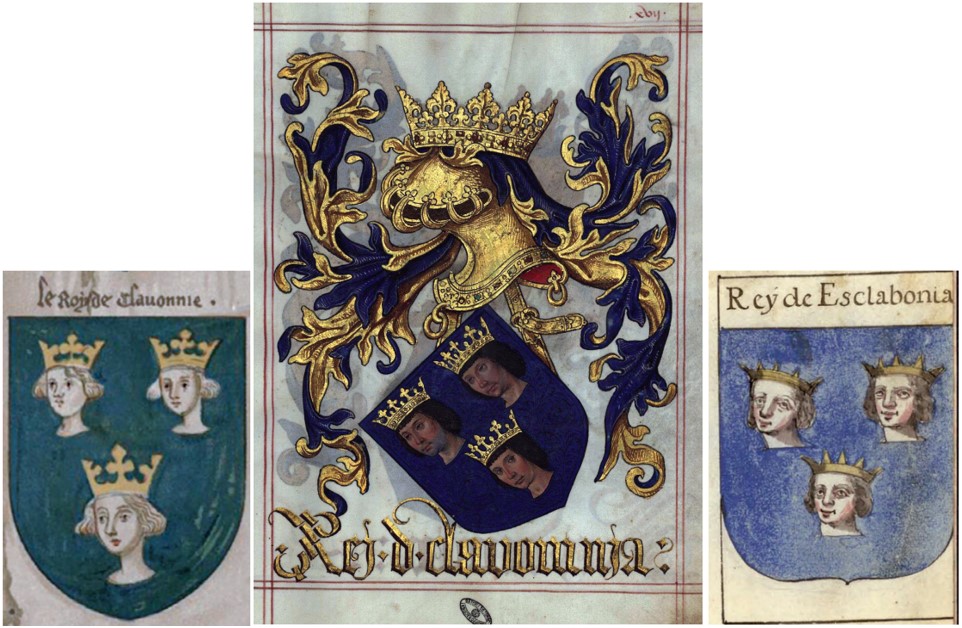 Grb „kralja Slavonije“, XV. stoljeće (preris). Grbovnik iz vremena engleskog kralja Henrika VI. (1422.-1461.; 1470.-1471.); Grb „kralja Slavonije” (Rej d Clavomnia), 1509. Grbovnik „Livro do Armeiro-Mor“; Grb „kralja Slavonije“ (Rey d Esclabonia). Španjolski grbovnik iz XVIII. stoljeća – „HRVATSKI GRBOVI…“