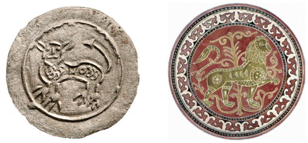 Lav u hodu s isplaženim jezikom, posljednja četvrtina XII. stoljeća. Revers novca kralja Bele III.; Lav u hodu s drvom života u pozadini, razdoblje kralja Bele III. (rekonstrukcija). Mural u ostrogonskoj katedrali – „HRVATSKI GRBOVI…“