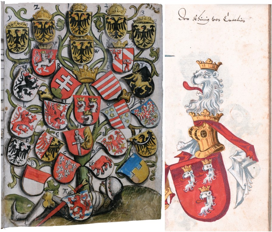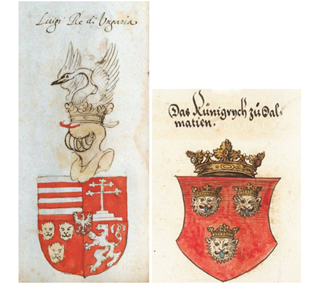 Tri okrunjene srebrne lavlje glave s isplaženim plavim jezicima kao grb Dalmacije. Tiskano izdanje „Kronike Sabora u Konstanci“ Ulricha Richentala iz 1483.; Okrunjeni crveni lav u propnju na štitu sa srebrno-plavim gredama (rekonstrukcija). Grb dinastije Luksemburgovaca – „HRVATSKI GRBOVI…“