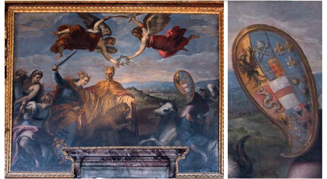 Jacopo Palma Mlađi, „Venecija pobjeđuje Europu“. Alegorijska slika u senatskoj dvorani Duždeve palače naslikana oko 1590. Na heraldički lijevoj strani razdijeljenog štita alegorije Europe vidi se grb Hrvatsko-dalmatinskoga kraljevstva s tri leopardove glave na plavom – „HRVATSKI GRBOVI…“