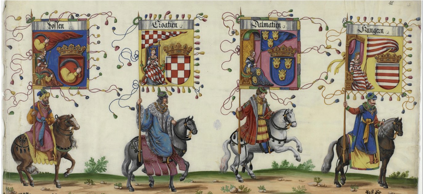 Dio povorke stjegonoša s grbovima Bosne, Hrvatske i Dalmacije. „Trijumfalna povorka cara Maksimilijana“, 1507.-1518. – „HRVATSKI GRBOVI…“