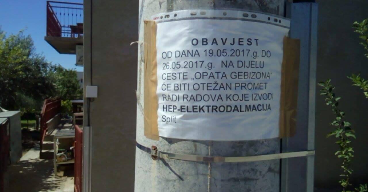 Naš sugrađanin nas je zamolio da istražimo – Na Mezanovcima, u Ulici opata Gebizona, izgrađena je nova zgrada gdje je investitor prokopao asfalt za dovod električne energije za koju je uredno platio. Međutim, Elektrodalmacija, ni nakon dva mjeseca i stotine upornih poziva, nije sanirala asfalt. Stanari okolnih zgrada uništavaju osobna vozila, a i nezavršeni posao sanacije asfalta nagrđuje okoliš što se vidi iz priloženih slika.