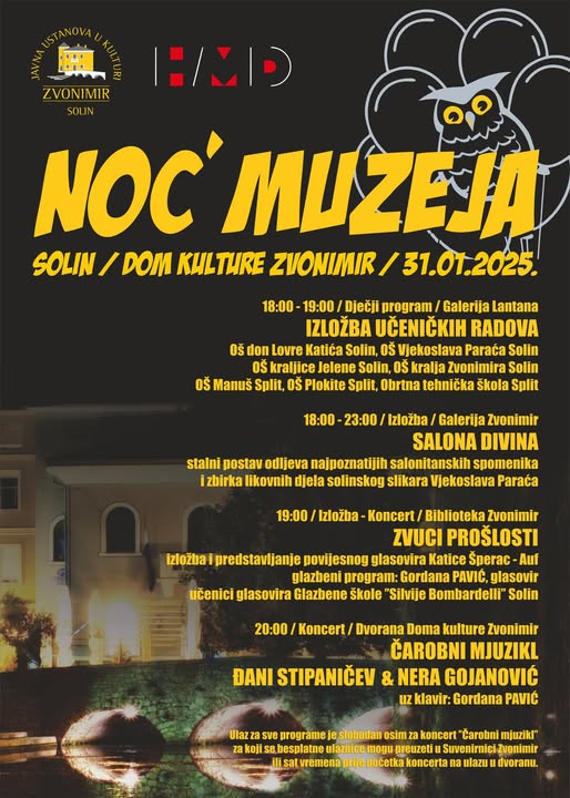 U petak, 31. siječnja 2025. Javna ustanova u kulturi Zvonimir Solin priređuje bogat i zanimljiv program u povodu Noći muzeja: