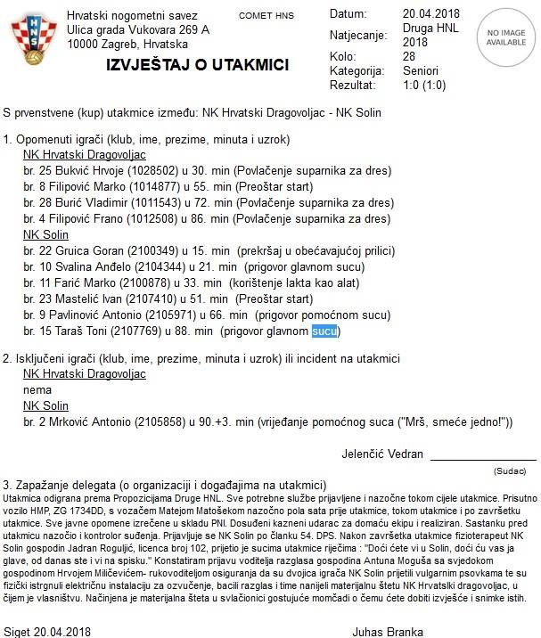 U 28. kolu NK Solin gostovao je kod Hrvatskog Dragovoljca protiv kojeg je izgubio 1:0, poraz i nije neka vijest koliko ta da je tijekom utakmice zabilježeno vrijeđanje, prijetnje i razbijanje od strane nogometaša Solina, kao i stručnog stožera, istih onih koje mi porezni obveznici financiramo s par milja kuna godišnje.