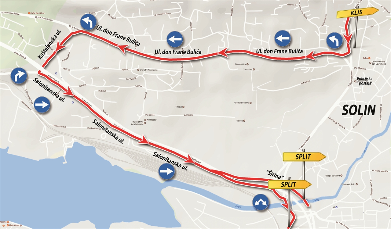 Iz toga razloga će se u ponedjeljak 6. veljače s početkom od 9 sati uspostaviti privremena regulacija prometa koja bi se odvijala na slijedeći način: Iz Splita promet bi se odvijao kao do sada prema Klisu i to Ulicom Stjepana Radića, a vozila iz pravca Klisa prometovat će alternativnim pravcima put Svetoga Kaja i to Ulicom don Frane Bulića, prema Kaštelanskoj pa Salonitanskom ulicom (poznatija kao Zaobilaznica) prema Širini.
