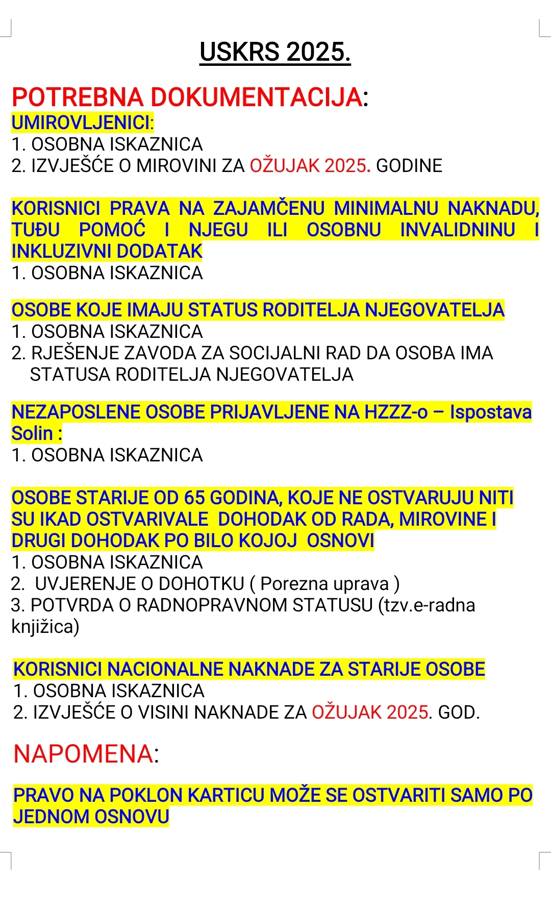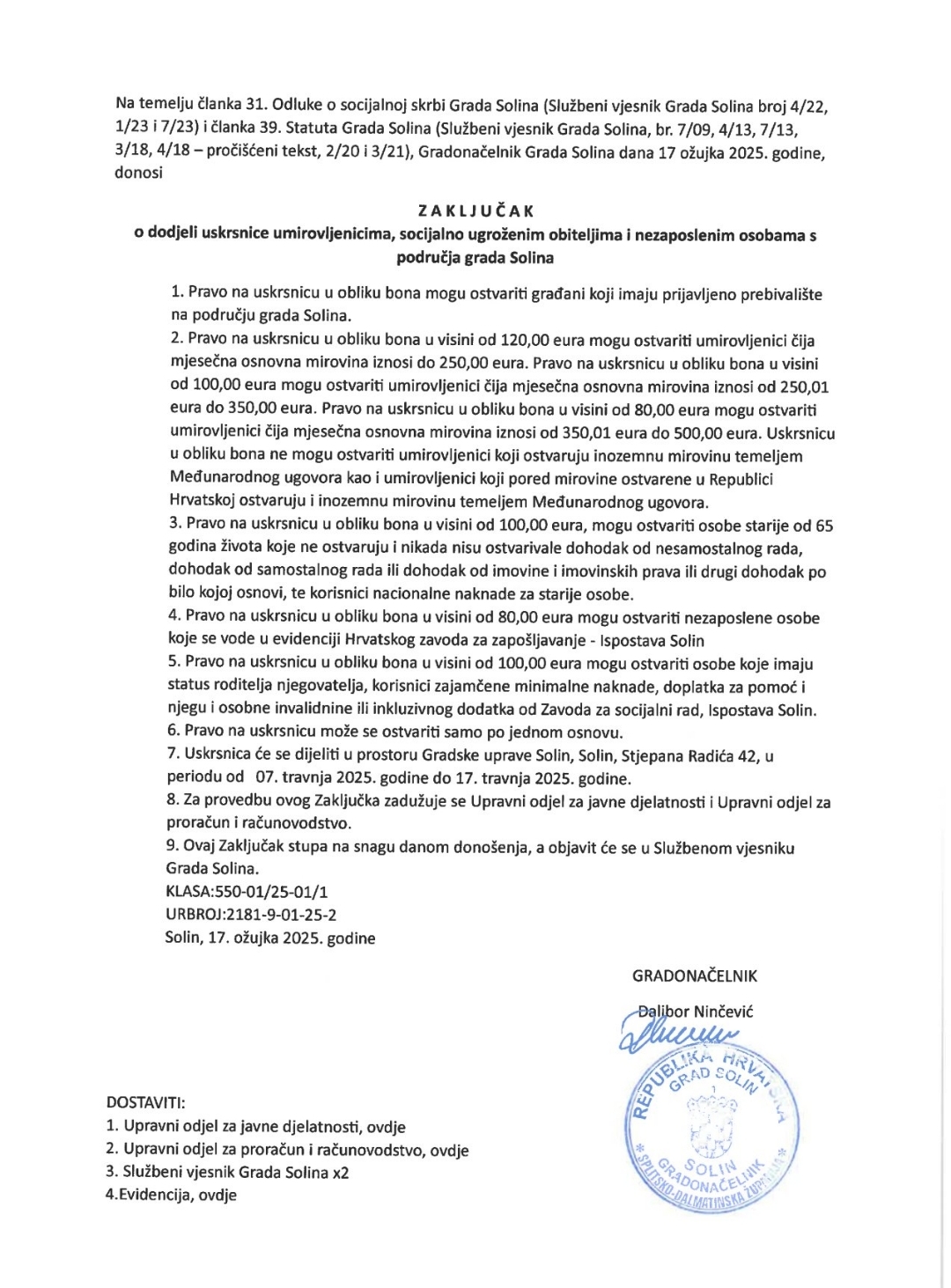 Na temelju članka 31. Odluke o socijalnoj skrbi Grada Solina (Službeni vjesnik Grada Solina broj 4/22, 1/23 i 7/23) i članka 39. Statuta Grada Solina (Službeni vjesnik Grada Solina, br. 7/09, 4/13, 7/13, 3/18, 4/18 – pročišćeni tekst, 2/20 i 3/21), Gradonačelnik Grada Solina dana 17. ožujka 2025. godine, donosi Zaključak o dodjeli uskrsnice umirovljenicima, socijalno ugroženim obiteljima i nezaposlenim osobama s područja grada Solina.