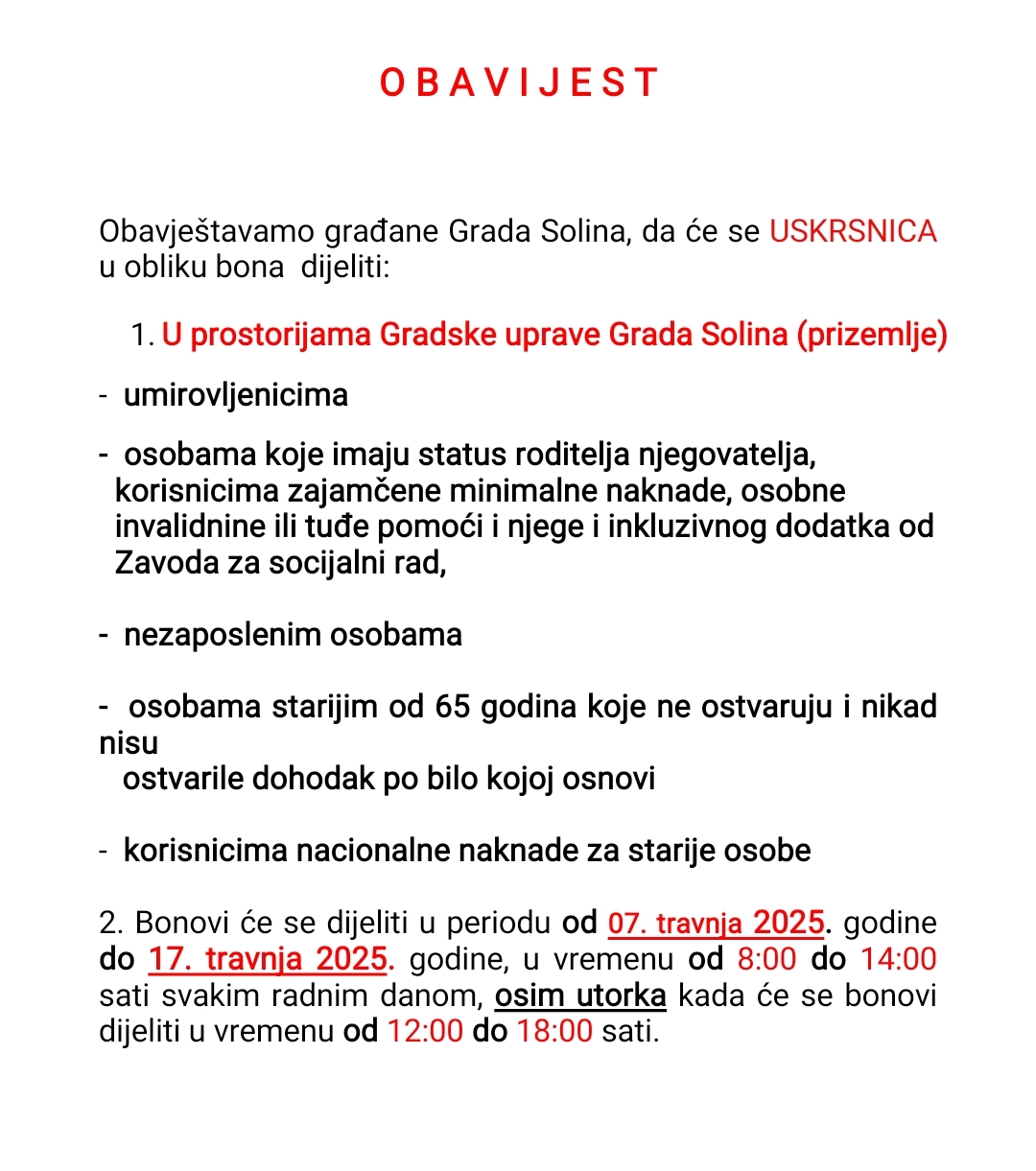 Uskrsnica (bonovi) će se dijeliti u prostoru Gradske uprave Solin, Stjepana Radića 42, Solin u periodu od 07. travnja 2025. do 17. travnja 2025. godine, u vremenu od od 08:00 do14:00 sati svakim radnim danom osim utorka kada će se bonovi dijeliti u vremenu od 12:00 do 18:00 sati.