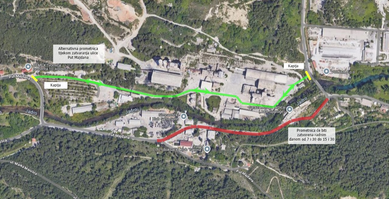 Na grafici ispod je naznačen potez ulice Put Majdana koji će se u navedenom periodu zatvarati te trasa alternativne prometnice kroz krug Cemexove tvornice 10 kolovoza.