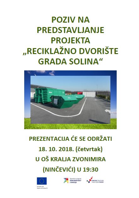 Sukladno najavi gradonačelnika Grada Solina Dalibora Ninčevića u četvrtak 18. listopada 2018. u prostorijama Osnovne škole kralja Zvonimira u Ninčevićima s početkom u 19.30 sati održat će se prezentacija projekta Reciklažnog dvorišta grada Solina.
