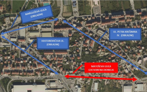 Iz Županijske uprave za ceste priopćili su da zbog radova na zamjeni elektroenergetskog kabela, izgradnje spoja oborinske kanalizacije i vodovodne mreže, od danas, utorka, 14. travnja, u 9 sati, do četvrtka, 30. travnja, za sav promet zatvara se dionica Matoševe ulice u Solinu od raskrižja s Ulicom Petra Hektorovića pa do raskrižja s Ulicom Petra Krešimira IV.