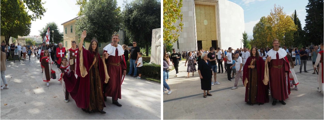 Kraljica Jelena „Slavna“ (Barbara Alilović) i kralj Dmitar Zvonimir (Ante Nadomir Tadić Šutra) na čelu povorke pozdravljaju okupljene na Gospinu otoku u Solinu
